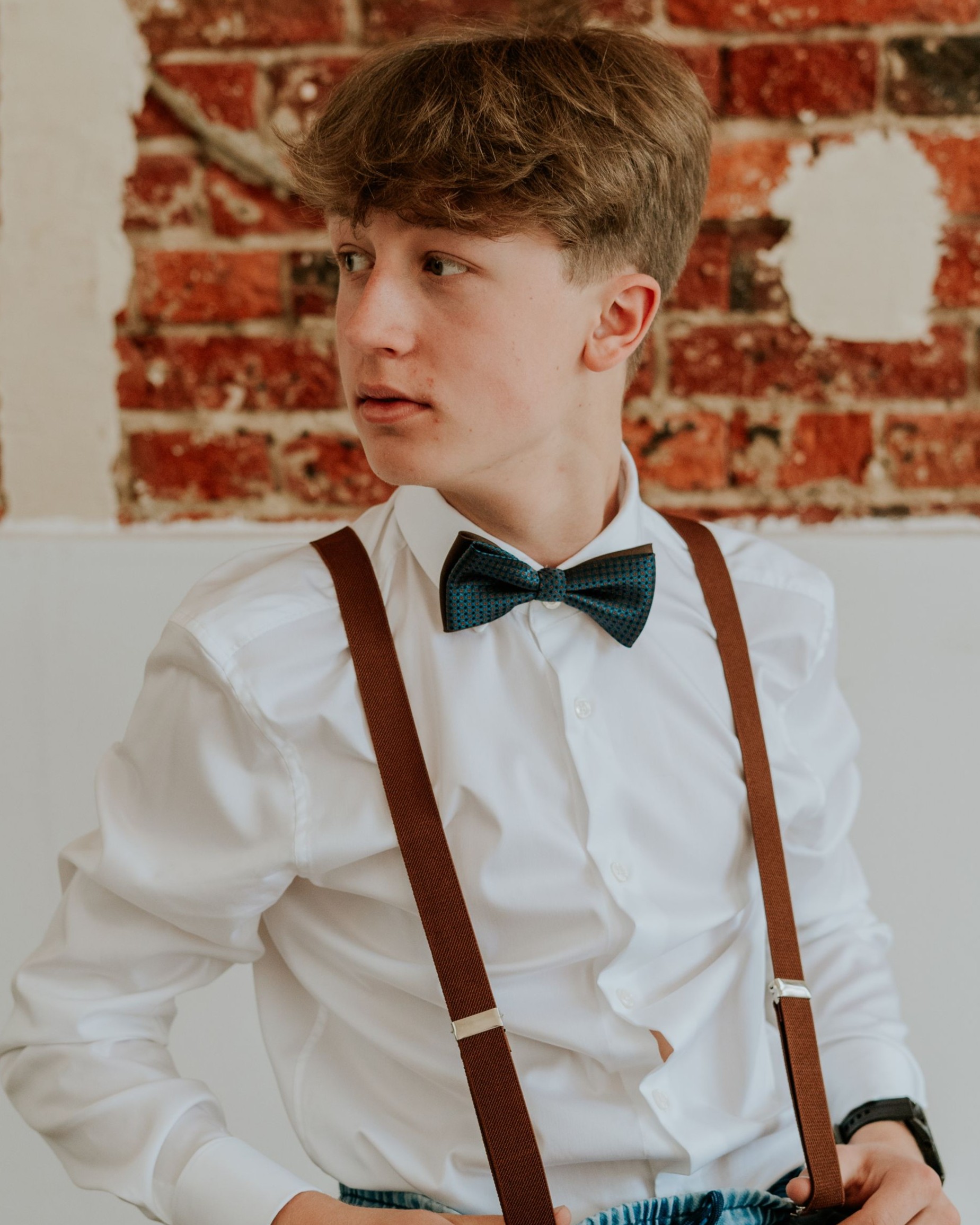 Szelki - To modna i praktyczna alternatywa dla paska, zwłaszcza dla młodszych chłopców. Szelki dobrze utrzymują spodnie na miejscu i nadają stylizacji bardziej retro charakter. Można je dobrać w kolorze pasującym do muchy czy krawata, co stworzy spójną kompozycję.