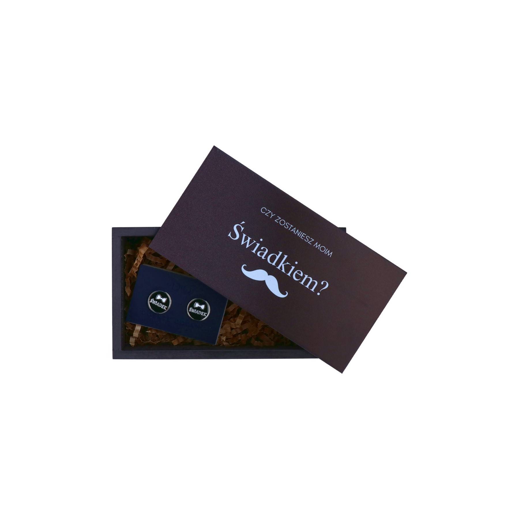 Na Dobrzedodane.pl dostępne są eleganckie, drewniane pudełka, w których umieszczony są drobny upominek w postaci spinek do mankietów. Wewnątrz jest także miejsce na dodatkowy prezent lub karteczkę ze spersonalizowanym tekstem, np. z pytaniem: „Czy zostaniesz moim świadkiem?”.