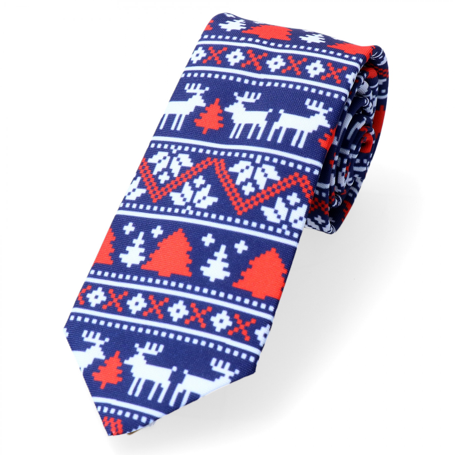 Krawat świąteczny Na Granatowym Tle Reniferki I Czerwone Choinki