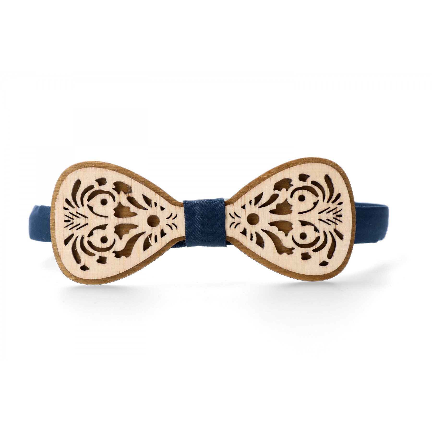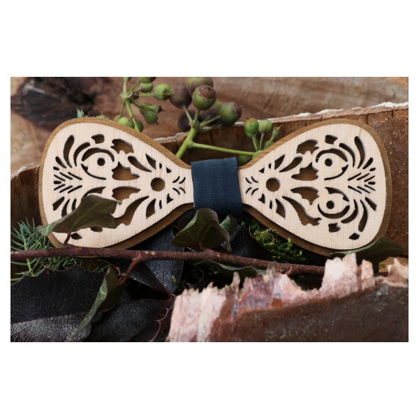 • muszka drewniana z jasnego drewna z pięknym folkowym wzorem i zaokrąglonymi brzegami