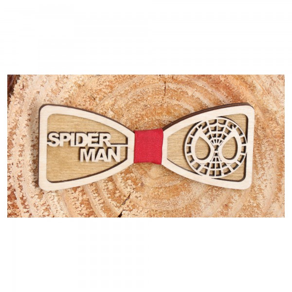 • muszka drewniana po jednej stronie ,muszki napis "spider man", a po drugiej symbol człowieka pająka