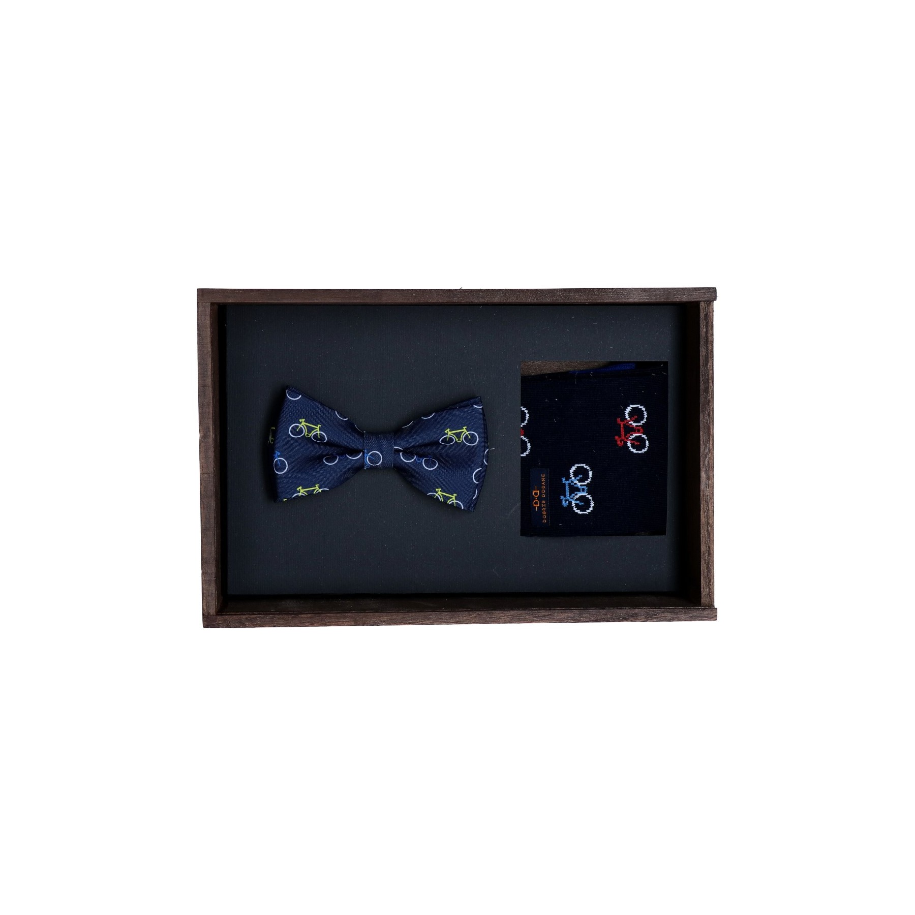 Zestaw Prezentowy Skarpety + Mucha W Rowerki Niebieskie W Eleganckim Drewnianym Pudełku