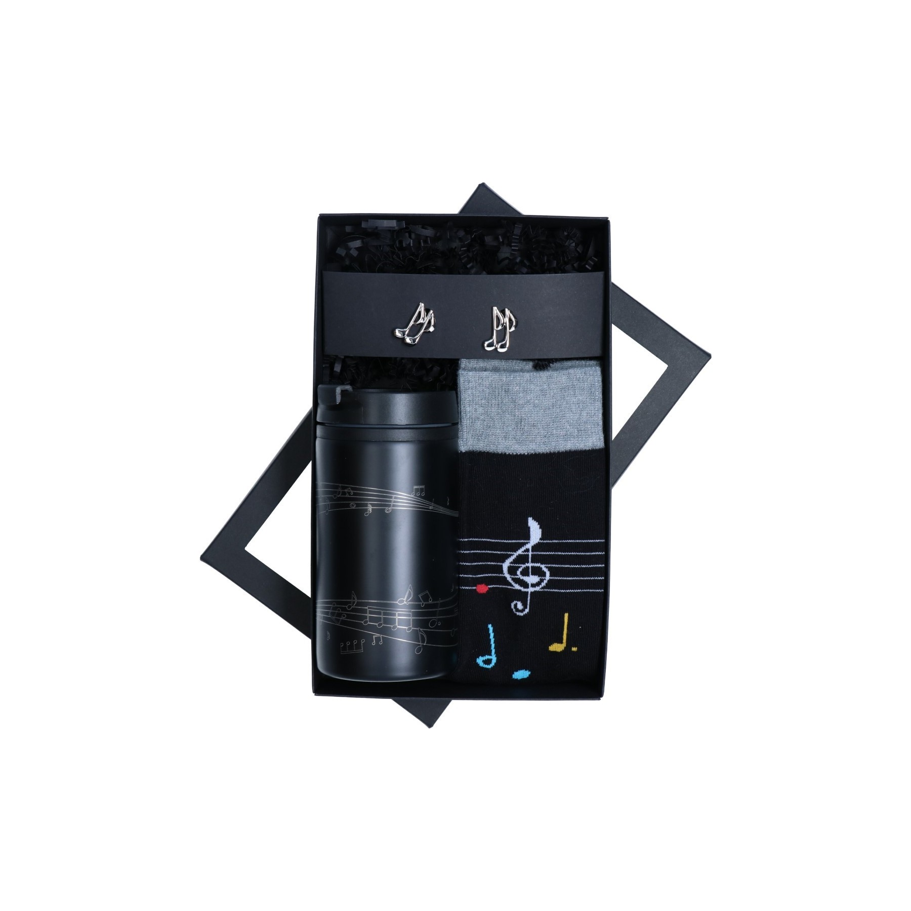 - Kubek idealny na kawę czy herbatę, zdobiony srebrnym motywem nut.