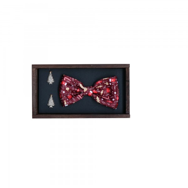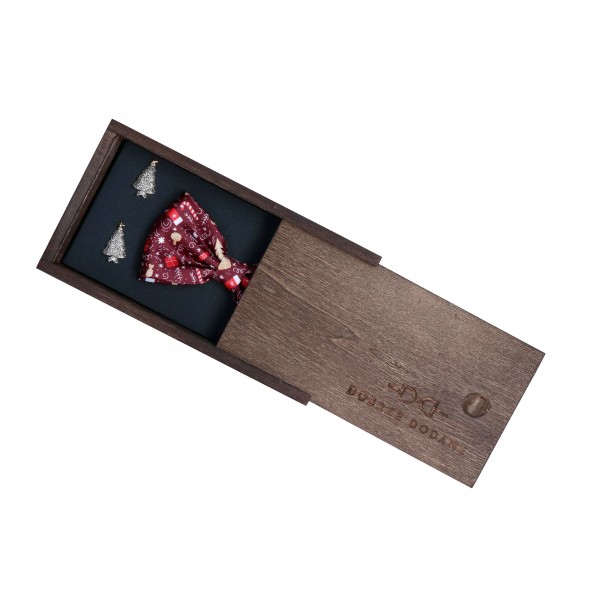 Zestaw Prezentowy Mucha Świąteczna Bordowa w Choinki Ze Spinkami w Drewnianym Pudełku